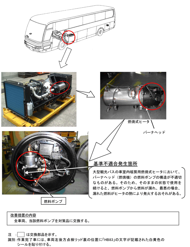 大型観光バスの車室内暖房用燃焼式ヒータにおいて、バーナヘッド(燃焼機)の燃料ポンプの構造が不適切なものがある。そのため、そのままの状態で使用を続けると、燃料ポンプから燃料が漏れ、最悪の場合、漏れた燃料がヒータの熱により発火するおそれがある。 | ||