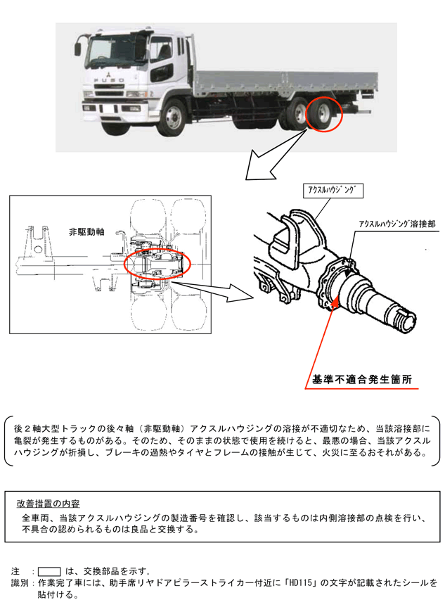 | 改善措置の内容 | 全車両、当該アクスルハウジングの製造番号を確認し、該当するものは内側溶接部の点検を行い、不具合の認められるものは良品と交換する。 | ||