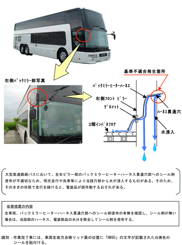 大型高速路線バスにおいて、左右ピラー部のバックミラーヒーターハーネス貫通穴部へのシール剤塗布が不適切なため、雨天走行や洗車等により当該穴部から水が浸入するものがある。そのため、そのままの状態で走行を続けると、電装品が誤作動するおそれがある。 | ||