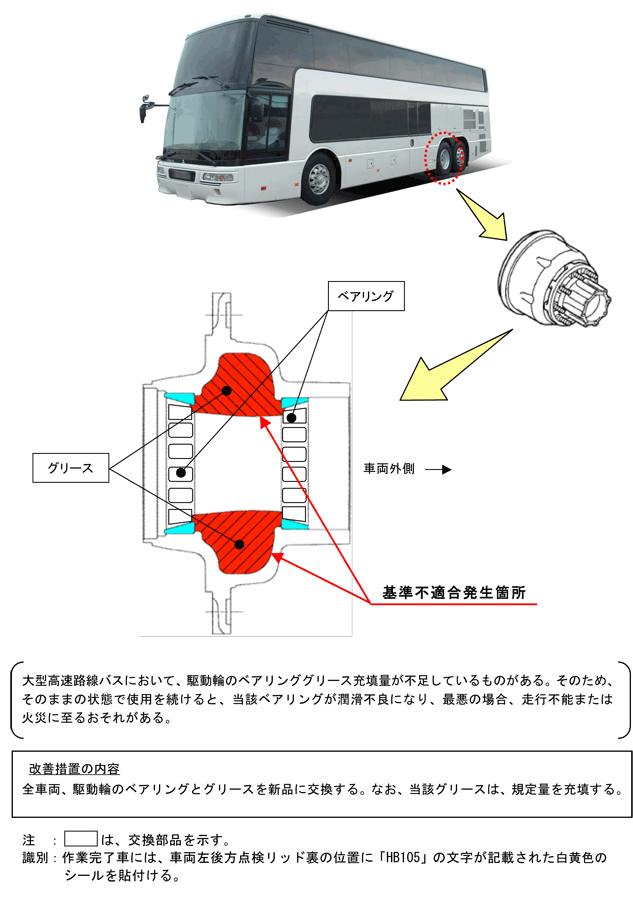 大型高速路線バスにおいて、駆動輪のベアリンググリース充填量が不足しているものがある。そのため、そのままの状態で使用を続けると、当該ベアリングが潤滑不良になり、最悪の場合、走行不能または火災に至るおそれがある。 | ||