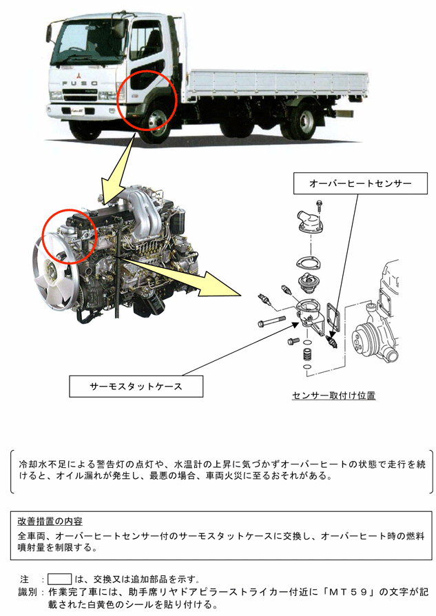 | 改善措置の内容 | 全車両、オーバーヒートセンサー付のサーモスタットケースに交換し、オーバーヒート時の燃料噴射量を制限する。 | ||