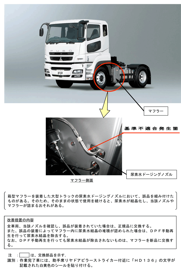| 改善措置の内容 | 全車両、当該ノズルを確認し、誤品が装着されていた場合は、正規品に交換する。また、誤品の装着によってマフラー内に尿素水結晶の堆積が認められた場合は、DPF手動再生を行って尿素水結晶を除去する。 なお、DPF手動再生を行っても尿素水結晶が除去されないものは、マフラーを新品に交換する。 | ||