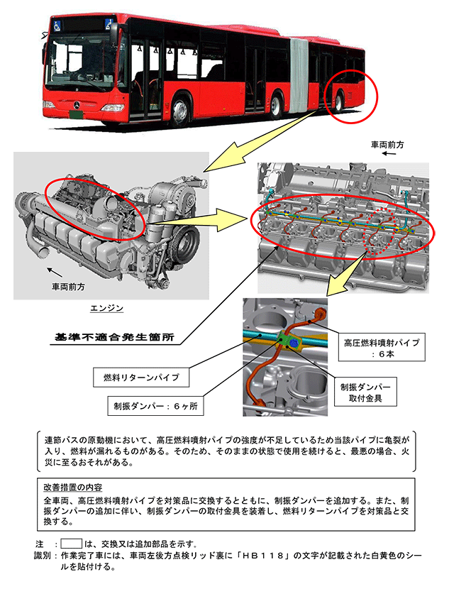 連節バスの原動機において、高圧燃料噴射パイプの強度が不足しているため当該パイプに亀裂が入り、燃料が漏れるものがある。そのため、そのままの状態で使用を続けると、最悪の場合、火災に至るおそれがある。