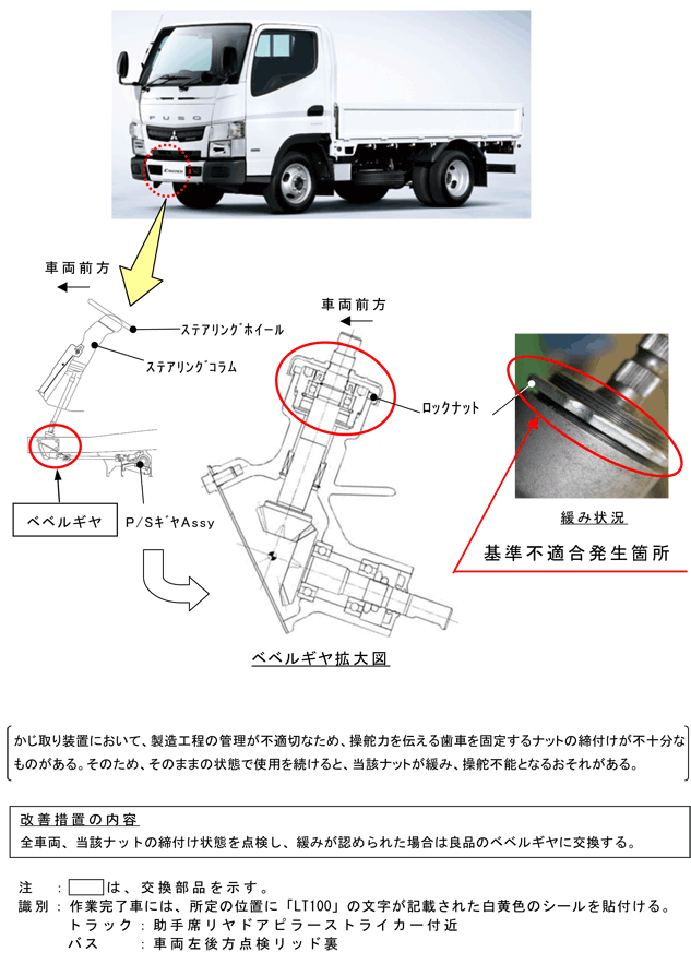 | ふそうキャンター、エアロエース、エアロクィーンのかじ取り装置(ベベルギヤ)について、平成23年9月27日に下記のリコールを国土交通省に届け出ました。ご愛用車の措置について、販売会社から早急にご連絡・ご相談をさせていただきますので、よろしくお願い申し上げます。 ユーザの皆様には大変ご迷惑をおかけいたしますことを、心よりお詫び申し上げます。 |