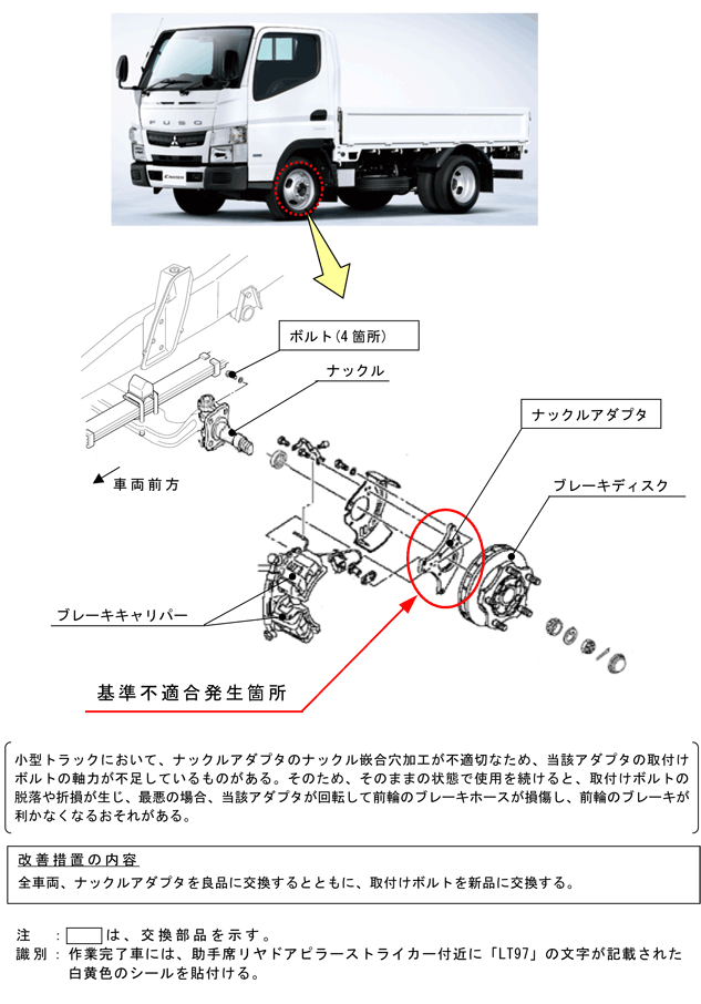 | 改善措置の内容 | 全車両、ナックルアダプタを良品に交換するとともに、取付けボルトを新品に交換する。 | ||