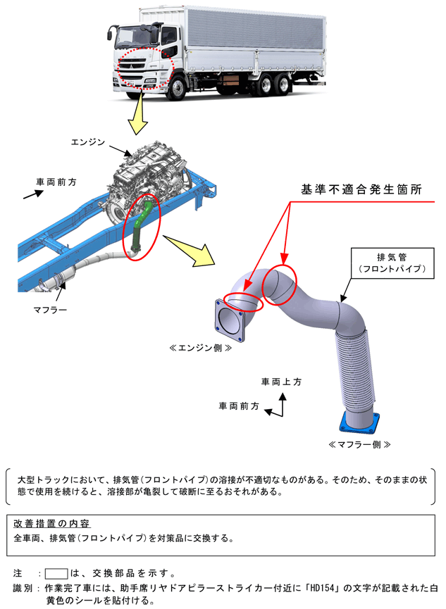 大型トラックにおいて、排気管(フロントパイプ)の溶接が不適切なものがある。そのため、そのままの状態で使用を続けると、溶接部が亀裂して破断に至るおそれがある。 | ||