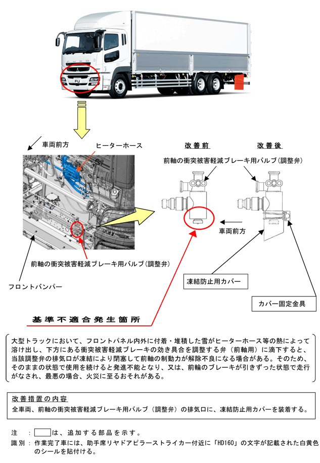 | 改善措置の内容 | 全車両、前軸の衝突被害軽減ブレーキ用バルブ(調整弁)の排気口に、凍結防止用カバーを装着する。 | ||