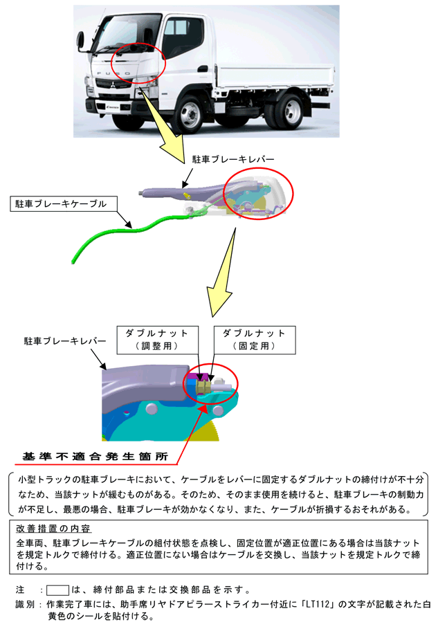 小型トラックの駐車ブレーキにおいて、ケーブルをレバーに固定するダブルナットの締付けが不十分なため、当該ナットが緩むものがある。そのため、そのまま使用を続けると、駐車ブレーキの制動力が不足し、最悪の場合、駐車ブレーキが効かなくなり、また、ケーブルが折損するおそれがある。