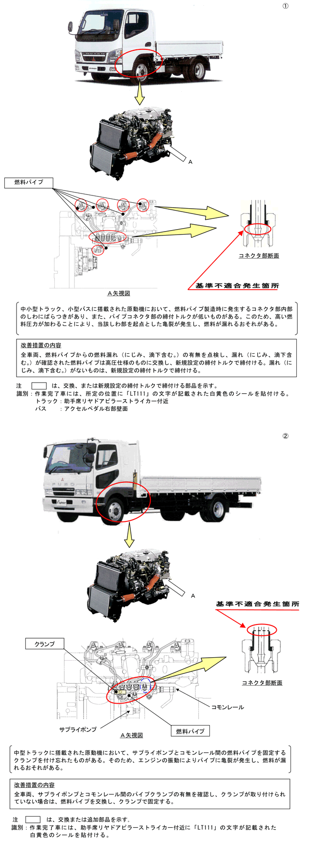 | ふそうファイター、キャンター、ローザの燃料装置(燃料パイプ)について、平成24年11月15日に下記のリコールを国土交通省に届け出ました。ご愛用車の措置について、販売会社から早急にご連絡・ご相談をさせていただきますので、よろしくお願い申し上げます。 ユーザの皆様には大変ご迷惑をおかけいたしますことを、心よりお詫び申し上げます。 |