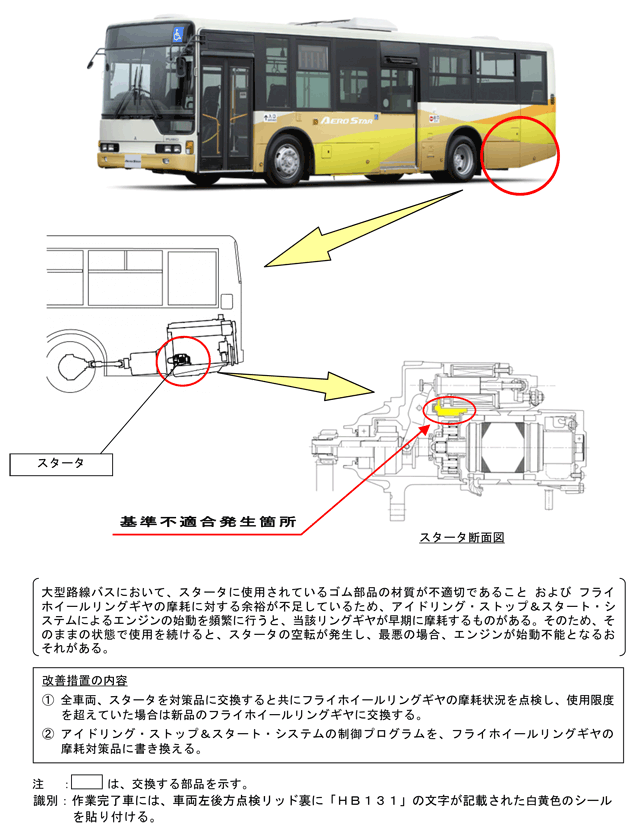 | ふそうエアロスターの原動機(スタータ)について、平成25年2月21日に下記のリコールを国土交通省に届け出ました。ご愛用車の措置について、販売会社から早急にご連絡・ご相談をさせていただきますので、よろしくお願い申し上げます。 ユーザの皆様には大変ご迷惑をおかけいたしますことを、心よりお詫び申し上げます。 |