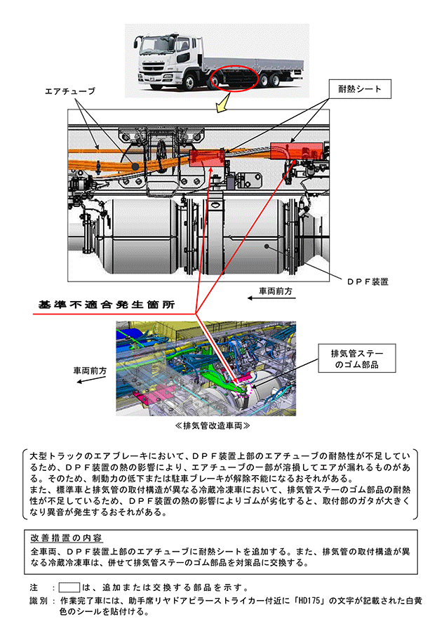 | 改善措置の内容 | 全車両、DPF装置上部のエアチューブに耐熱シートを追加する。また、排気管の取付構造が異なる冷蔵冷凍車は、併せて排気管ステーのゴム部品を対策品に交換する。 | ||