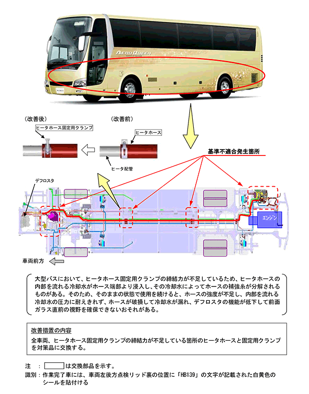 改善措置の内容 全車両、ヒータホース固定用クランプの締結力が不足している箇所のヒータホースと固定用クランプを対策品に交換する。