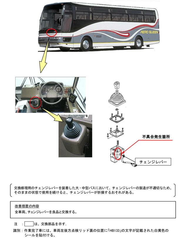 交換修理用のチェンジレバーを装着した大・中型バスにおいて、チェンジレバーの製造が不適切なため、そのままの状態で使用を続けると、チェンジレバーが折損するおそれがある。 | ||