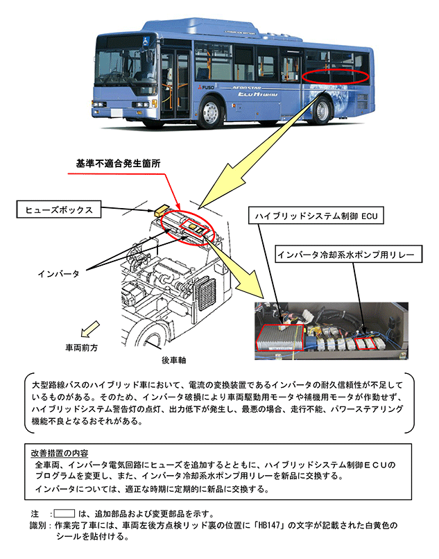 | 改善措置の内容 | 全車両、インバータ電気回路にヒューズを追加するとともに、ハイブリッドシステム制御ECUのプログラムを変更し、また、インバータ冷却系水ポンプ用リレーを新品に交換する。 インバータについては、適正な時期に定期的に新品に交換する。 |
