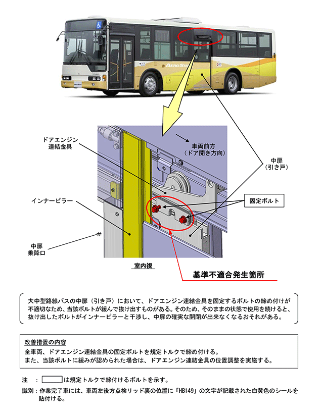 大中型路線バスの中扉(引き戸)において、ドアエンジン連結金具を固定するボルトの締め付けが不適切なため、当該ボルトが緩んで抜け出すものがある。そのため、そのままの状態で使用を続けると、抜け出したボルトがインナーピラーと干渉し、中扉の確実な開閉が出来なくなるおそれがある。 | ||