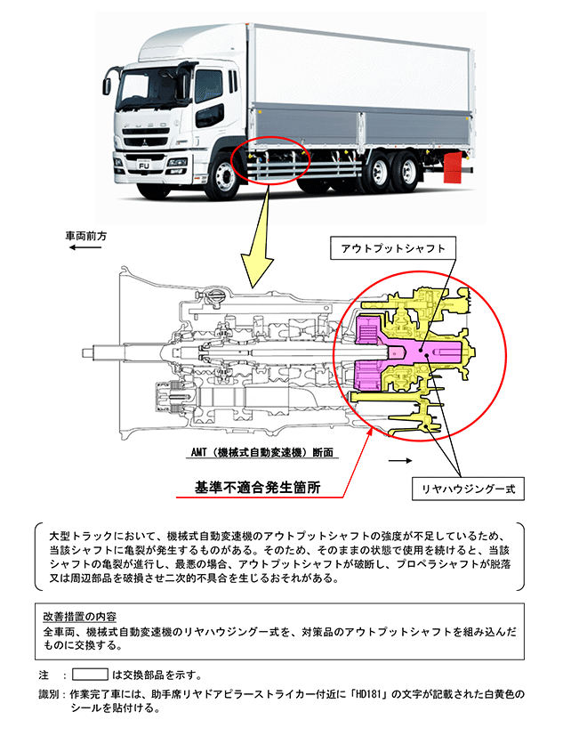 | 改善措置の内容 | 全車両、機械式自動変速機のリヤハウジング一式を、対策品のアウトプットシャフトを組み込んだものに交換する。 | ||