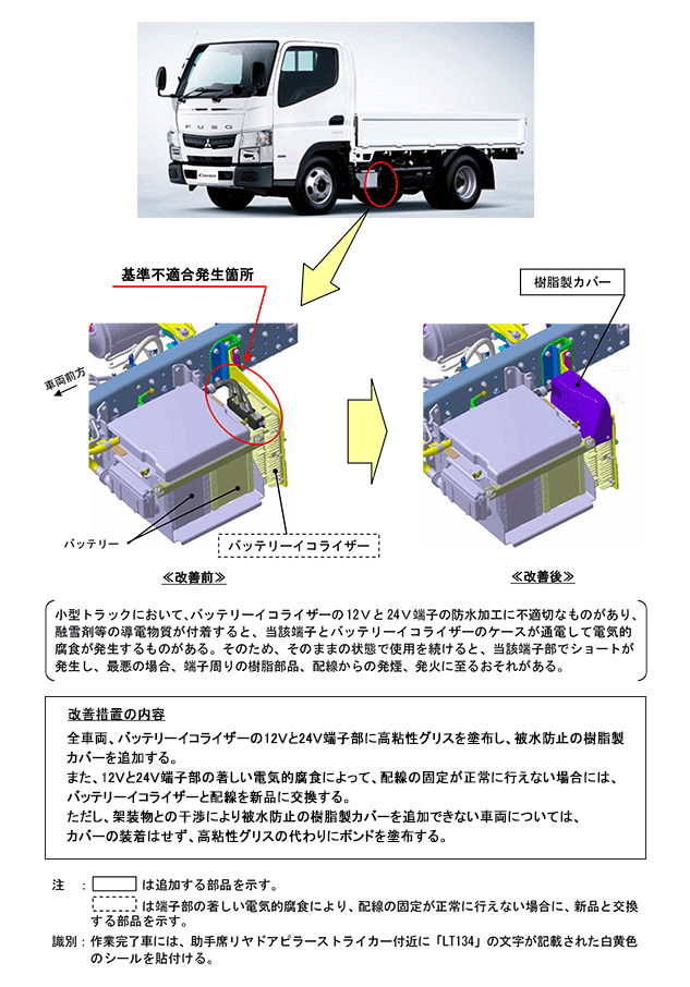 | 改善措置の内容 | 全車両、バッテリーイコライザーの12Vと24V端子部に高粘性グリスを塗布し、被水防止の樹脂製カバーを追加する。 また、12Vと24V端子部の著しい電気的腐食によって、配線の固定が正常に行えない場合には、バッテリーイコライザーと配線を新品に交換する。 ただし、架装物との干渉により被水防止の樹脂製カバーを追加できない車両については、カバーの装着はせず、高粘性グリスの代わりにボンドを塗布する。 |