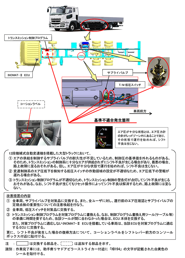 | ふそうスーパーグレートの動力伝達装置(サプライバルブ、低圧スイッチ、トランスミッション制御プログラム)について、平成27年9月10日に下記のリコールを国土交通省に届け出ました。ご愛用車の措置について、販売会社から早急にご連絡・ご相談をさせていただきますので、よろしくお願い申し上げます。 ユーザの皆様には大変ご迷惑をおかけいたしますことを、心よりお詫び申し上げます。 |