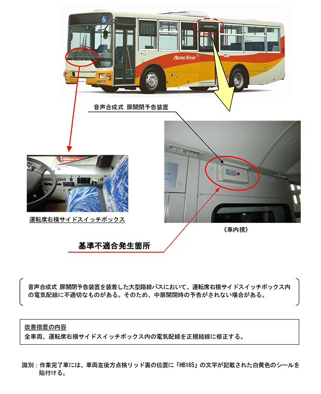 音声合成式 扉開閉予告装置を装着した大型路線バスにおいて、運転席右横サイドスイッチボックス内の電気配線に不適切なものがある。そのため、中扉開閉時の予告がされない場合がある。