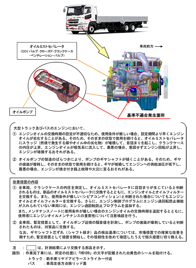 | ふそう スーパーグレート、エアロエース、エアロクィーンの原動機(オイルミストセパレータ、オイルポンプ)について、平成27年12月10日に下記のリコールを国土交通省に届け出ました。ご愛用車の措置について、販売会社から早急にご連絡・ご相談をさせていただきますので、よろしくお願い申し上げます。 ユーザの皆様には大変ご迷惑をおかけいたしますことを、心よりお詫び申し上げます。 |