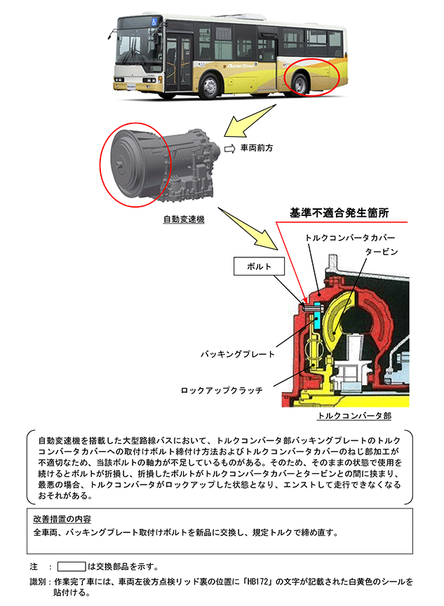 自動変速機を搭載した大型路線バスにおいて、トルクコンバータ部バッキングプレートのトルクコンバータカバーへの取付けボルト締付け方法およびトルクコンバータカバーのねじ部加工が不適切なため、当該ボルトの軸力が不足しているものがある。そのため、そのままの状態で使用を続けるとボルトが折損し、折損したボルトがトルクコンバータカバーとタービンとの間に挟まり、最悪の場合、トルクコンバータがロックアップした状態となり、エンストして走行できなくなるおそれがある。