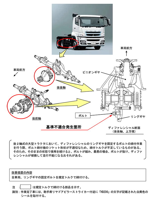 後2軸式の大型トラクタにおいて、ディファレンシャルのリングギヤを固定するボルトの締付作業を行う際、ボルト締付機のソケット形状が不適切なため、締付トルクが不足しているものがある。そのため、そのままの状態で使用を続けると、ボルトが緩み、最悪の場合、ボルトが抜け、ディファレンシャルが破損して走行不能になるおそれがある。 | ||
