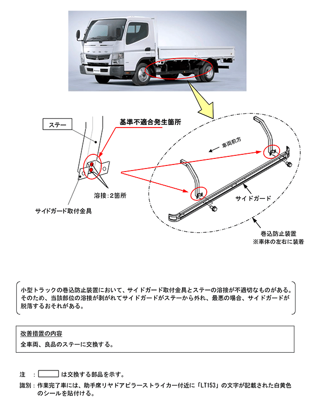 小型トラックの巻込防止装置において、サイドガード取付金具とステーの溶接が不適切なものがある。そのため、当該部位の溶接が剥がれてサイドガードがステーから外れ、最悪の場合、サイドガードが脱落するおそれがある。 | ||
