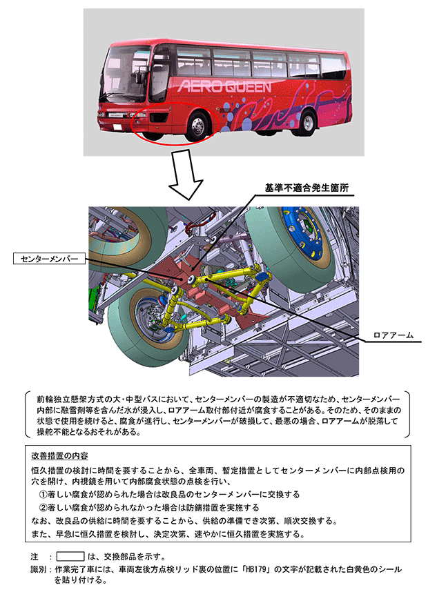 前輪独立懸架方式の大・中型バスにおいて、センターメンバーの製造が不適切なため、センターメンバー内部に融雪剤等を含んだ水が浸入し、ロアアーム取付部付近が腐食することがある。そのため、そのままの状態で使用を続けると、腐食が進行し、センターメンバーが破損して、最悪の場合、ロアアームが脱落して操舵不能となるおそれがある。