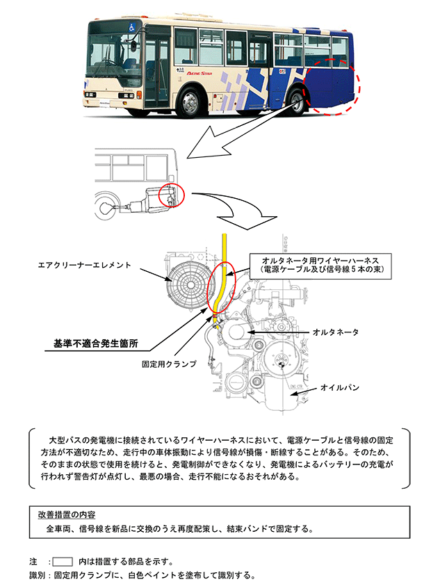 大型バスの発電機に接続されているワイヤーハーネスにおいて、電源ケーブルと信号線の固定方法が不適切なため、走行中の車体振動により信号線が損傷・断線することがある。そのため、そのままの状態で使用を続けると、発電制御ができなくなり、発電機によるバッテリーの充電が行われず警告灯が点灯し、最悪の場合、走行不能になるおそれがある。