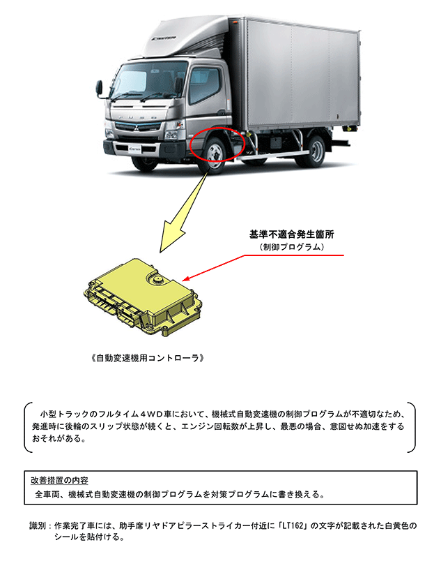 | 改善措置の内容 | 全車両、機械式自動変速機の制御プログラムを対策プログラムに書き換える。 | ||