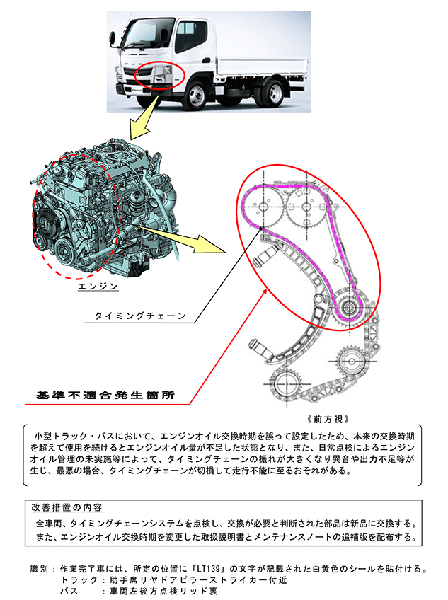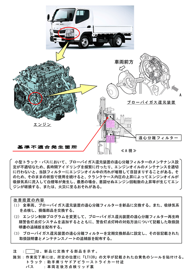 | 【注意事項】リコール対象車の車台番号の範囲には、対象とならない車両も含まれている場合があります。 「備考:ブローバイガス還元装置の遠心分離フィルターについては、今後、改良及びコスト低減に努めてまいります」 |