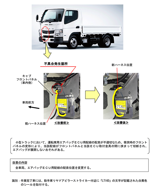 小型トラックにおいて、運転席用エアバッグECU用配線の配索が不適切なため、衝突時のフロントパネルの変形により、当該配線がフロントパネルと当該ECU取付金具の間に挟まって切断され、エアバッグが展開しないおそれがある。 | ||