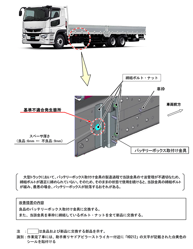 | 改善措置の内容 | 良品のバッテリーボックス取付け金具に交換する。 また、当該金具を車枠に締結しているボルト・ナットを全て新品に交換する。 | ||