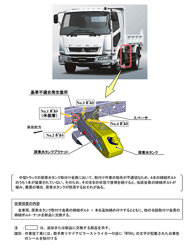| 改善措置の内容 | 全車両、尿素水タンク取付け金具の締結ボルト1本を追加締め付けするとともに、他の当該取付け金具の締結ボルト・ナットを新品に交換する。 | ||