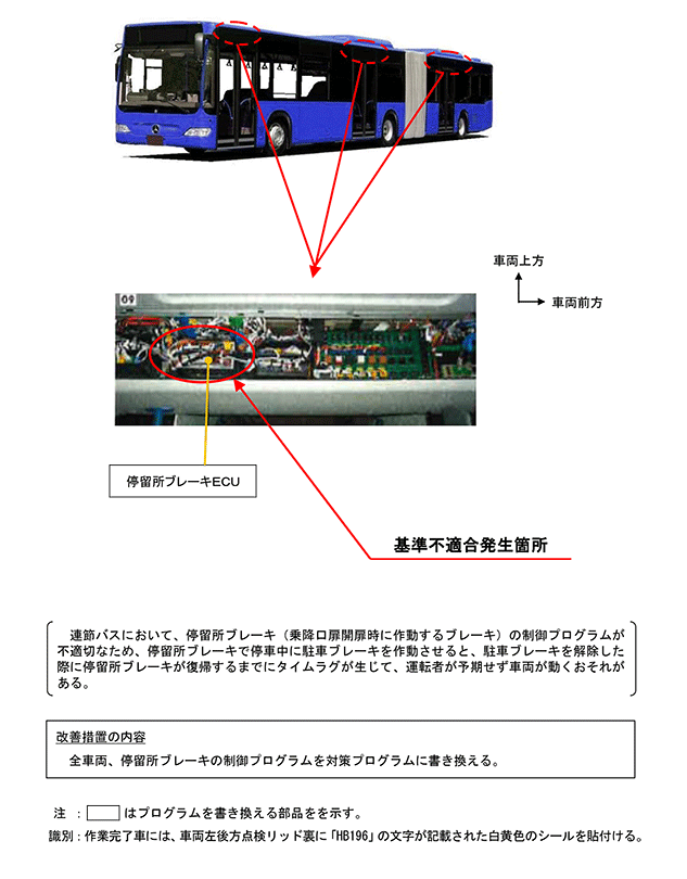 連節バスにおいて、停留所ブレーキ(乗降口扉開扉時に作動するブレーキ)の制御プログラムが不適切なため、停留所ブレーキで停車中に駐車ブレーキを作動させると、駐車ブレーキを解除した際に停留所ブレーキが復帰するまでにタイムラグが生じて、運転者が予期せず車両が動くおそれがある。 | ||