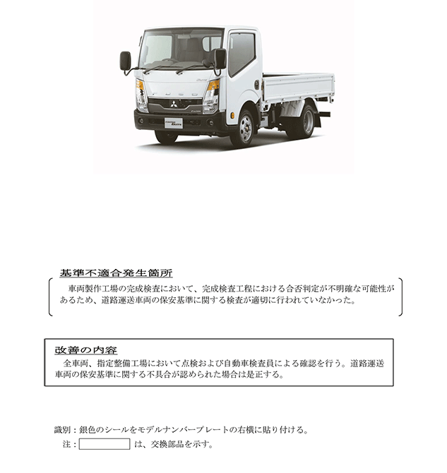 | 改善措置の内容 | 全車両、指定整備工場において点検および自動車検査員による確認を行う。道路運送車両の保安基準に関する不具合が認められた場合は是正する。 | ||