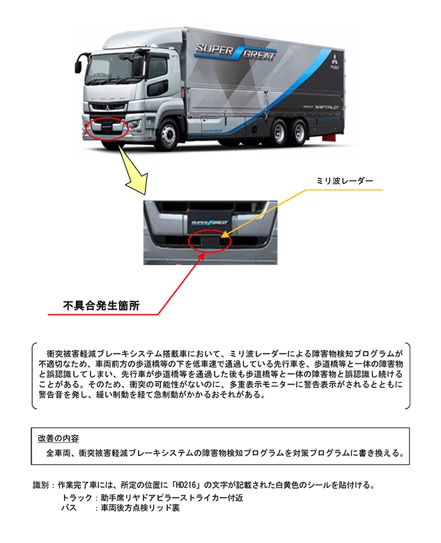 | ふそう スーパーグレート、キャンター、エアロエース、エアロクィーンのその他の装置(前方障害物衝突軽減制御装置)について、平成30年12月20日に下記の改善対策を国土交通省に届け出ました。ご愛用車の措置について、販売会社から早急にご連絡・ご相談をさせていただきますので、よろしくお願い申し上げます。 ユーザの皆様には大変ご迷惑をおかけいたしますことを、心よりお詫び申し上げます。 |