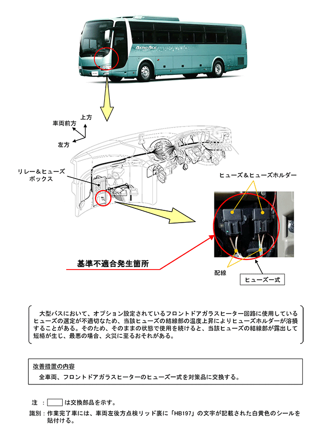 大型バスにおいて、オプション設定されているフロントドアガラスヒーター回路に使用しているヒューズの選定が不適切なため、当該ヒューズの結線部の温度上昇によりヒューズホルダーが溶損することがある。そのため、そのままの状態で使用を続けると、当該ヒューズの結線部が露出して短絡が生じ、最悪の場合、火災に至るおそれがある。