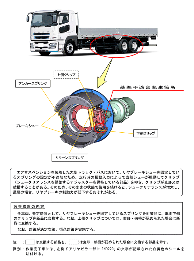 エアサスペンションを装着した大型トラック・バスにおいて、リヤブレーキシューを固定しているスプリングの設定が不適切なため、走行時の振動入力によって当該シューが振動してクリップ(シュークリアランスを調整するアジャスターを保持している部品)を叩き、クリップが変形又は破損することがある。そのため、そのままの状態で使用を続けると、シュークリアランスが増大し、最悪の場合、リヤブレーキの制動力が低下するおそれがある。 | ||