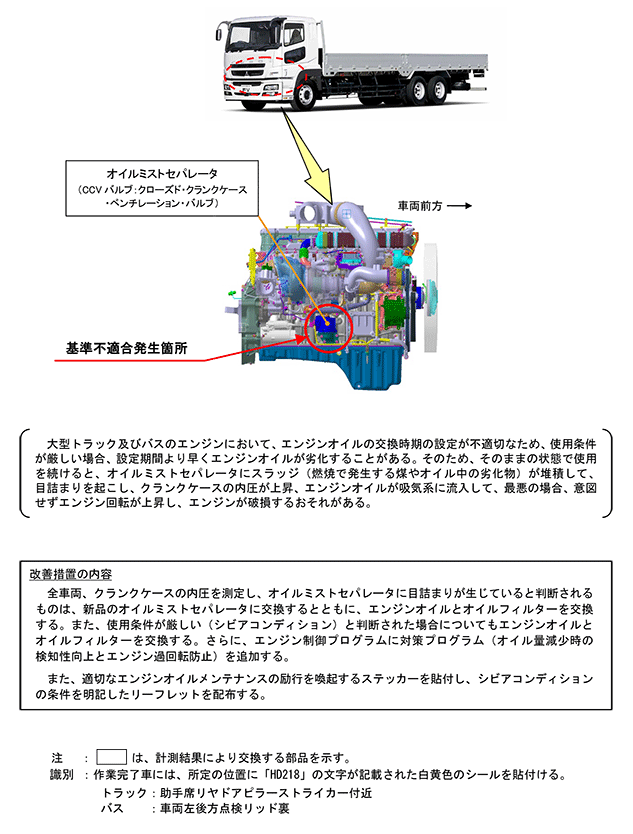 | 改善措置の内容 | 全車両、クランクケースの内圧を測定し、オイルミストセパレータに目詰まりが生じていると判断されるものは、新品のオイルミストセパレータに交換するとともに、エンジンオイルとオイルフィルターを交換する。また、使用条件が厳しい(シビアコンディション)と判断された場合についてもエンジンオイルとオイルフィルターを交換する。さらに、エンジン制御プログラムに対策プログラム(オイル量減少時の検知性向上とエンジン過回転防止)を追加する。 また、適切なエンジンオイルメンテナンスの励行を喚起するステッカーを貼付し、シビアコンディションの条件を明記したリーフレットを配布する。 |