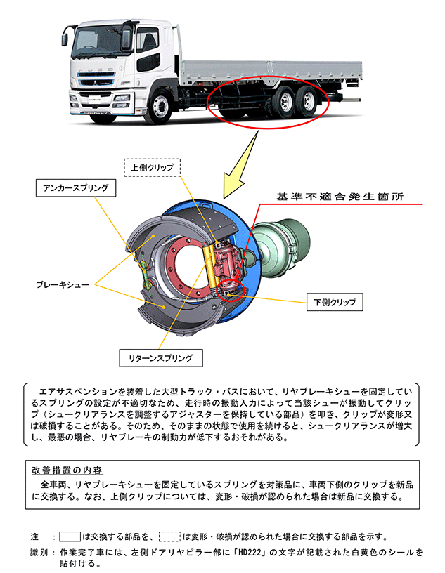 エアサスペンションを装着した大型トラック・バスにおいて、リヤブレーキシューを固定しているスプリングの設定が不適切なため、走行時の振動入力によって当該シューが振動してクリップ(シュークリアランスを調整するアジャスターを保持している部品)を叩き、クリップが変形又は破損することがある。そのため、そのままの状態で使用を続けると、シュークリアランスが増大し、最悪の場合、リヤブレーキの制動力が低下するおそれがある。 | ||