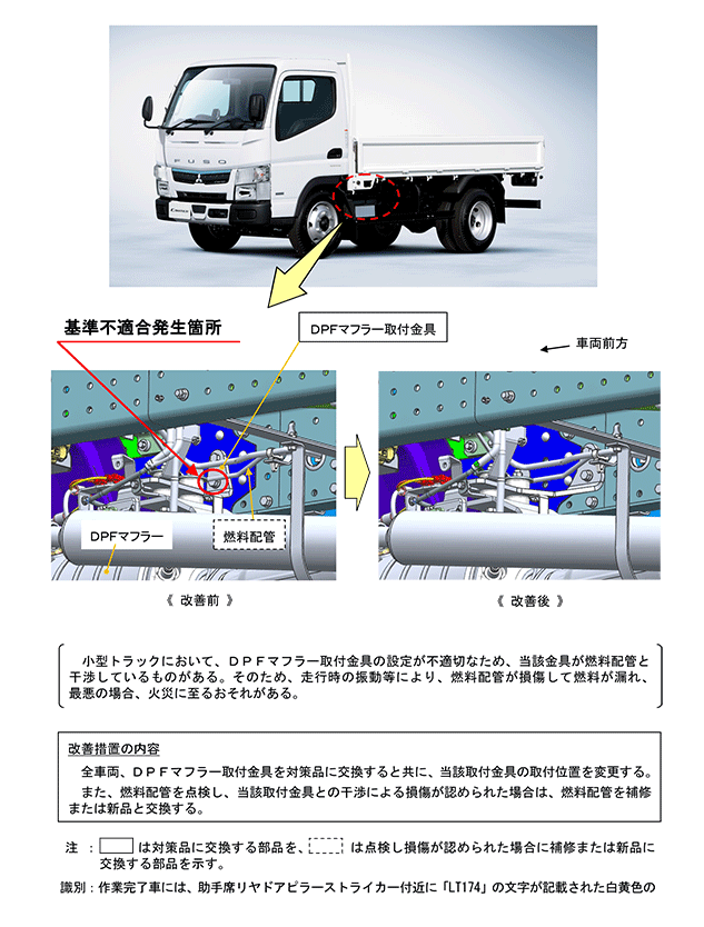 ふそうキャンターの排出ガス発散防止装置(DPFマフラー取付金具)について、令和元年11月14日に下記のリコールを国土交通省に届け出ました。ご愛用車の措置について、販売会社から早急にご連絡・ご相談をさせていただきますので、よろしくお願い申し上げます。