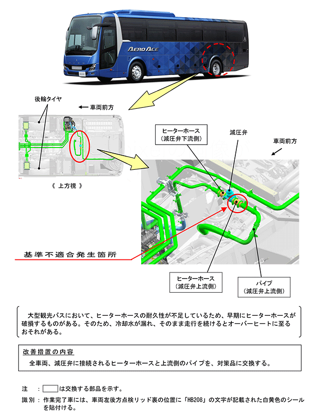 大型観光バスにおいて、ヒーターホースの耐久性が不足しているため、早期にヒーターホースが破損するものがある。そのため、冷却水が漏れ、そのまま走行を続けるとオーバーヒートに至るおそれがある。 | ||