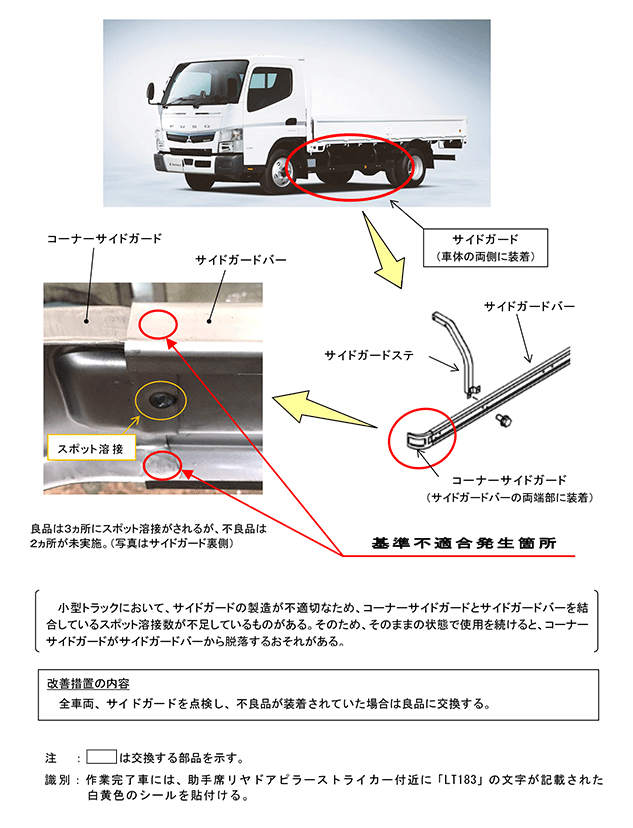 小型トラックにおいて、サイドガードの製造が不適切なため、コーナーサイドガードとサイドガードバーを結合しているスポット溶接数が不足しているものがある。そのため、そのままの状態で使用を続けると、コーナーサイドガードがサイドガードバーから脱落するおそれがある。 | ||