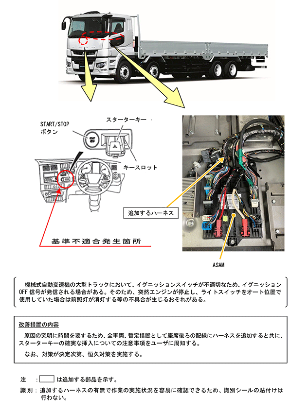 | 改善措置の内容 | 原因の究明に時間を要するため、全車両、暫定措置として座席後ろの配線にハーネスを追加すると共に、スターターキーの確実な挿入についての注意事項をユーザに周知する。 なお、対策が決定次第、恒久対策を実施する。 | ||