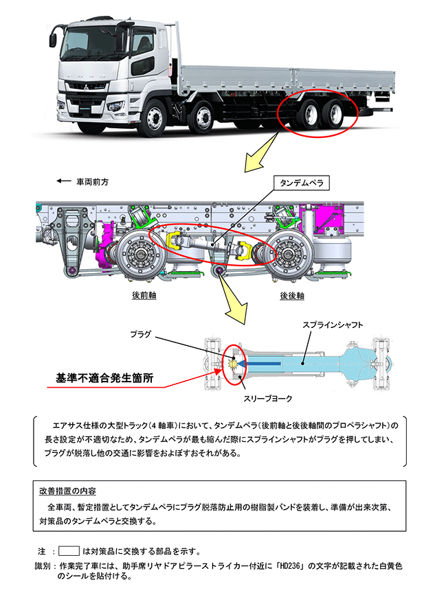 エアサス仕様の大型トラック(4軸車)において、タンデムペラ(後前軸デフと後後軸デフ間のプロペラシャフト)の長さ設定が不適切なため、タンデムペラが最も縮んだ際にスプラインシャフトがプラグを押してしまい、プラグが脱落し他の交通に影響をおよぼすおそれがある。