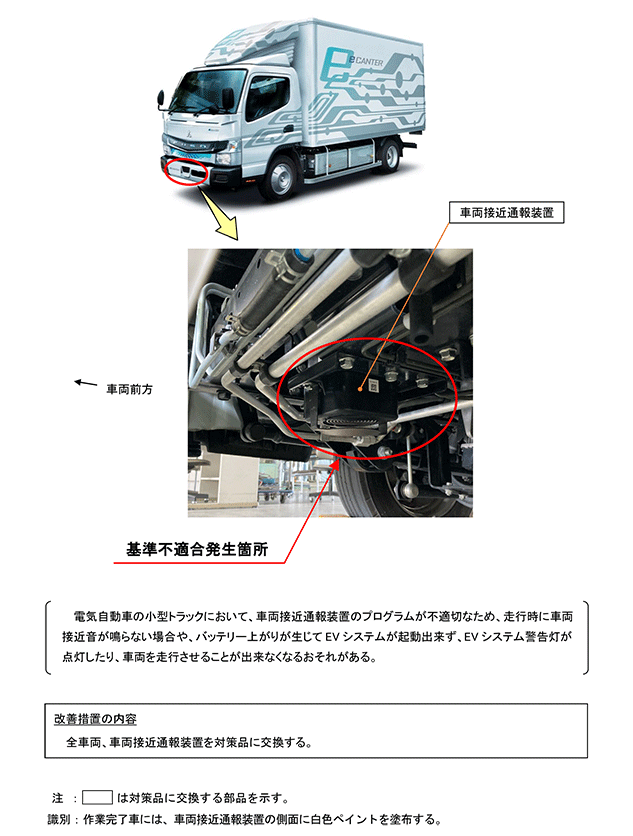 電気自動車の小型トラックにおいて、車両接近通報装置のプログラムが不適切なため、走行時に車両接近音が鳴らない場合や、バッテリー上がりが生じてEVシステムが起動出来ず、EVシステム警告灯が点灯したり、車両を走行させることが出来なくなるおそれがある。