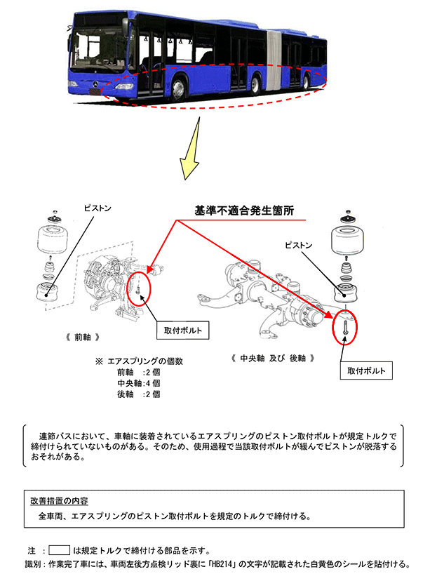連節バスにおいて、車軸に装着されているエアスプリングのピストン取付ボルトが規定トルクで締付けられていないものがある。そのため、使用過程で当該取付ボルトが緩んでピストンが脱落するおそれがある。 | ||