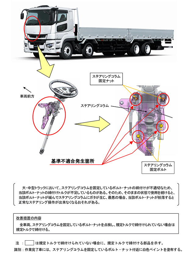 大・中型トラックにおいて、ステアリングコラムを固定しているボルト・ナットの締付けが不適切なため、当該ボルト・ナットの締付けトルクが不足しているものがある。そのため、そのままの状態で使用を続けると、当該ボルト・ナットが緩んでステアリングコラムにガタが生じ、最悪の場合、当該ボルト・ナットが脱落すると正常なステアリング操作が出来なくなるおそれがある。 | ||