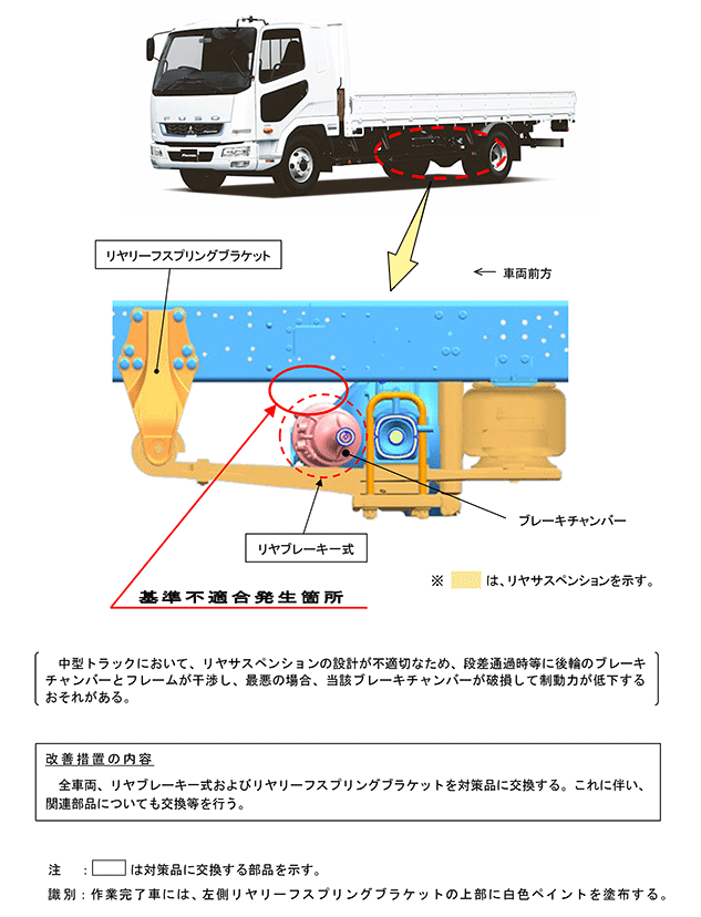 中型トラックにおいて、リヤサスペンションの設定が不適切なため、段差通過時等に後輪のブレーキチャンバーとフレームが干渉し、最悪の場合、当該ブレーキチャンバーが破損するおそれがある。